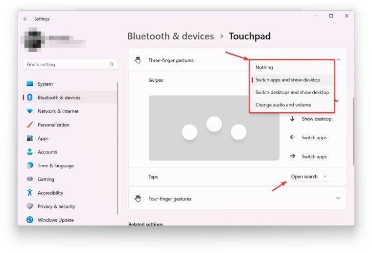 您还可以禁用三指和四指手势和点击。为此,请从下拉列表中选择无。