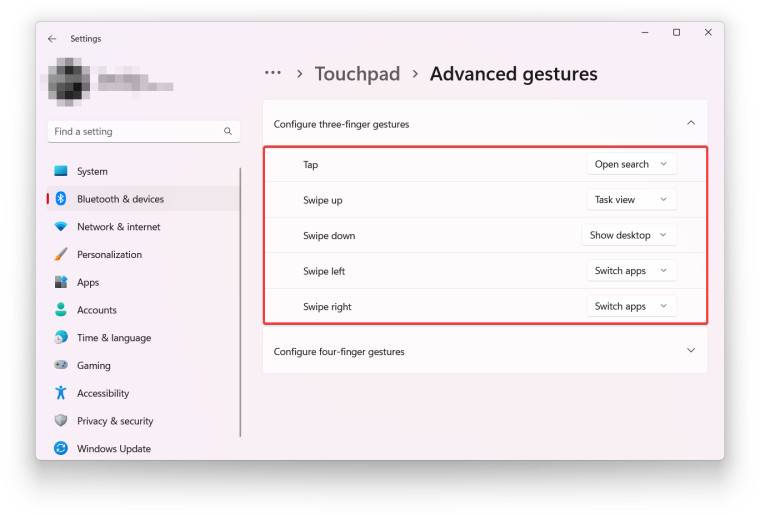 Win11 为带有 Windows Precision 触摸板驱动程序的笔记本电脑提供了多个预置配置文件。您可以个性化三指和四指手势,包括点击和滑动(向上、向下、向左和向右)。