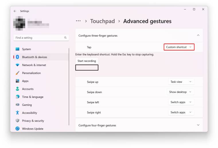 为 Win11 中的每个触摸板手势设置自定义操作。可用选项包括三指和四指点击以及四个方向的滑动(总共十个插槽)。