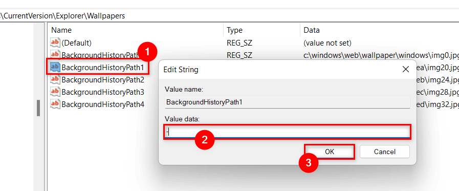 6、您可以看到 5 个BackgroundHistoryPath字符串值,其中包含最近的背景壁纸更改历史记录。