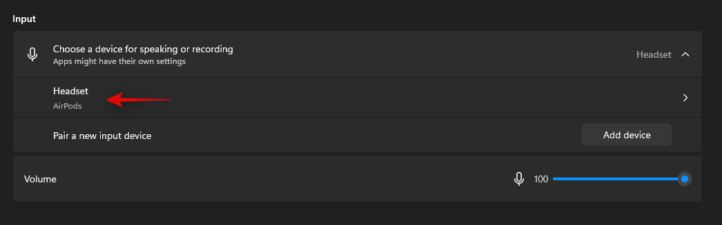 同样,如果您有多个输入设备连接到系统,请在“输入”部分下选择“Airpods”。如果没有,则应默认选择 Airpods 麦克风。