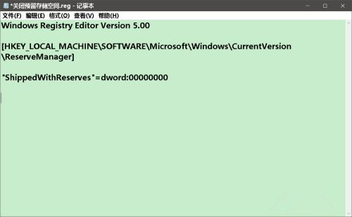 我们按照制作【启用预留存取空间.reg】文件的方法,制作一个【关闭预留存取空间.reg】的注册表文件添加到注册表中。