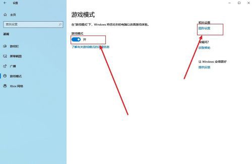 4、最后在右侧界面中将【游戏模式】下方的开关打开即可,如果感觉还是不是很流畅可以点击右侧的【图形设置】,将需要的程序图形首选项设置成【高性能】