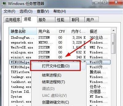 2、在进程选项中找到WIN10Helpe.exe这个进程,后右键单击选项,选择打开文件位置,转到下一步;