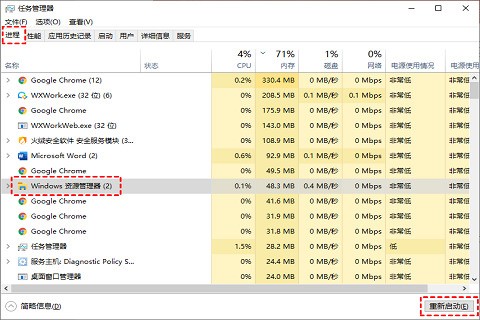 2、在“进程”选项卡中,找到“Windows资源管理器”,单击右下角的“重启”按钮。