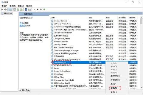 2、转到服务窗口,找到“User Manager”,右键单击,选择“属性”;