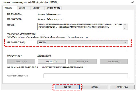 3、在弹出的User Manager属性窗口,设置“启动类型”为“自动”,单击“确定”。
