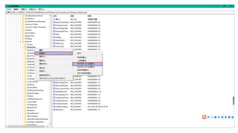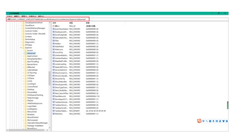 第三步,随后系统就会弹出注册表编辑器的窗口了,在此界面的左边,大家进入到【HKEY_CURRENT_USERSOFTWAREMicrosoftWindowsCurrentVersionExplorerAdvanced】途径中去。