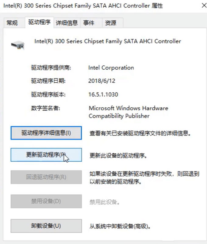 sata ahci驱动窗口,切换到驱动程序选项卡,然后点击更新驱动程序