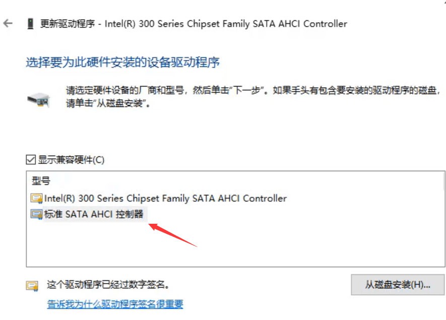 4、选择要为此硬件安装的设备驱动程序,请选定硬件设备的厂商和型号,然后单击“下一步”。如果手头有包含要安装的驱动程序的磁盘,请单击“从磁盘安装”。选择标准 sata ahci 控制器,再点击下一步;
