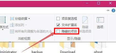 2、在查看选择中找到【隐藏的项目】并将其勾选即可