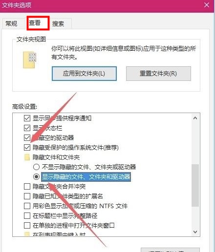 5、接着在弹出的【文件夹选项】界面中选择【查看】选项卡,并在下方【高级设置】中找到【隐藏文件和文件夹】选项,将其改成【显示隐藏的文件、文件夹和驱动器】,将【隐藏受保护的操作系统文件(推荐)】选项也可勾选,再点击【应用】和【确定】保存修改
