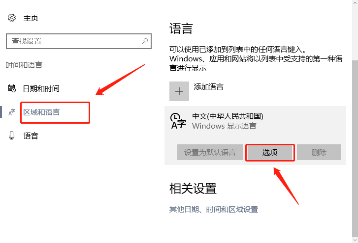 2、在打开的界面中选择【区域和语言】,并点击右侧【中文(中华人民共和国)】下方的【选项】按钮