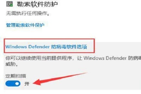 4、最后,在“病毒和威胁防护”窗口的底部,向下滚动到“windows Defender 防病毒软件选项”。点击这个选项并关闭下面的周期性扫描