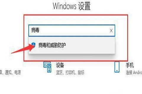 2、打开设置后,在搜索框中输入“病毒”,并单击关键字“病毒和威胁防护”;
