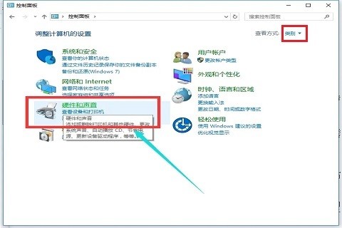 3、然后,在控制面板中,选择查看模式右上角的“类别”,找到“硬件和声音”,点击打开。