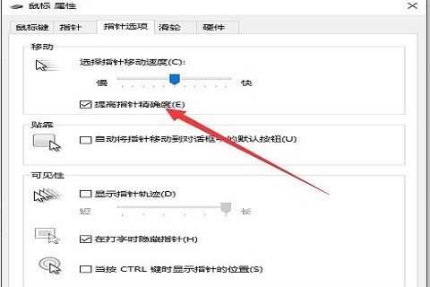 6、在指针选项中,找到“移动”下的“提高指针精确度”,把前方的勾选去掉。