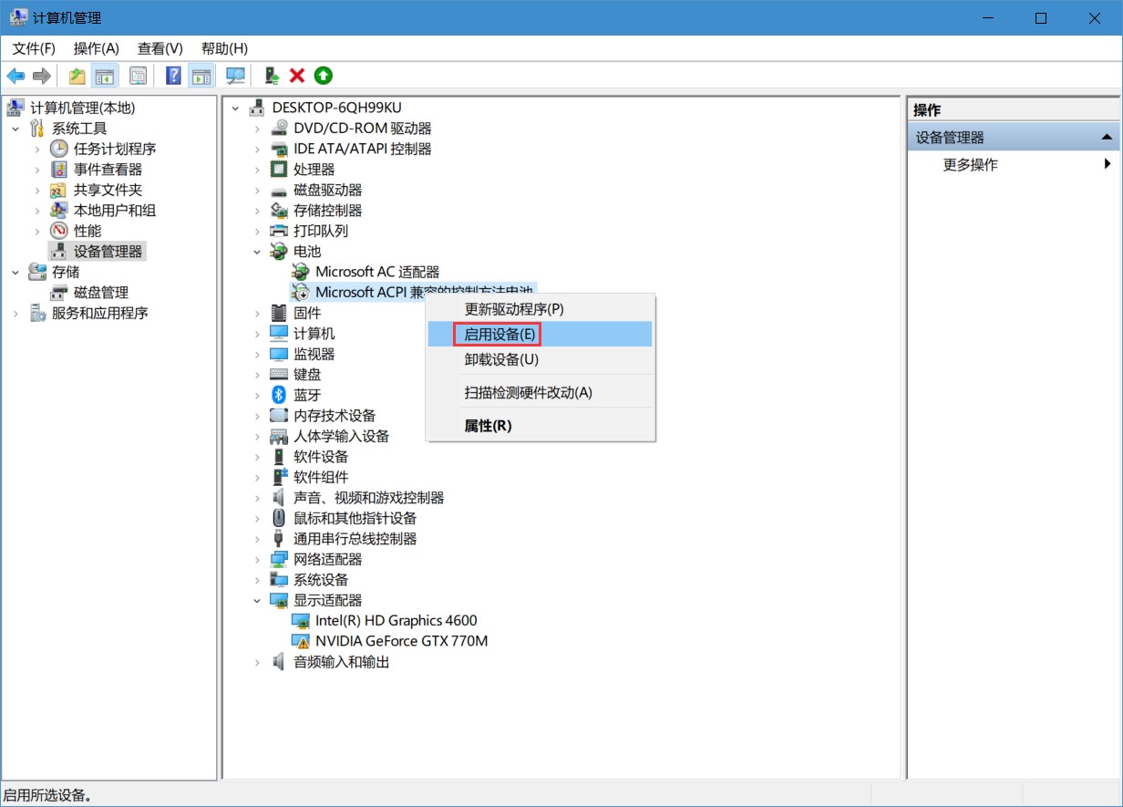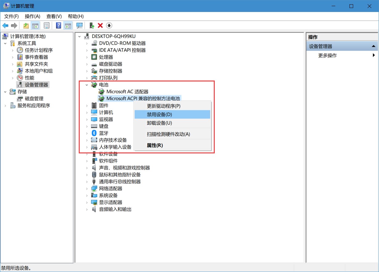 2、展开“电池”,右键单击“Microsoft acpi兼容控制方法电池”,启动“禁用设备”。