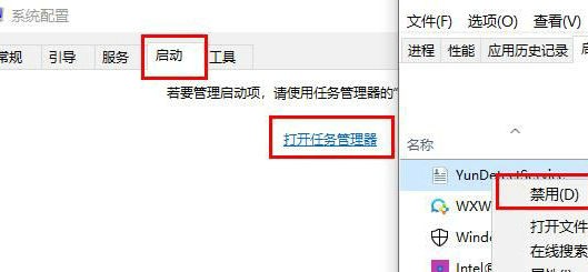 4、点击“启动”,点击“打开任务管理器”,点击启动项,点击禁用;
