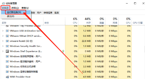 3、然后点击任务管理器页面左上角的“文件”,选择“运行新任务”选项。
