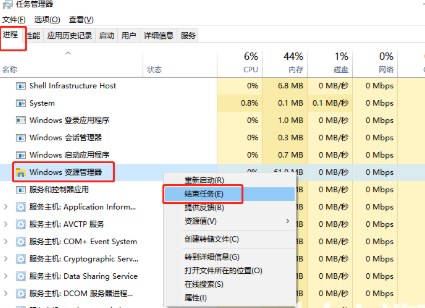 2、在“任务管理器”页面,切换到“进程”选项。找到Windows资源管理器。找到并右击“结束进程”按钮。