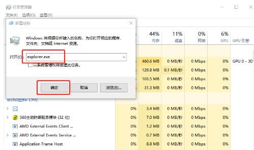 4、在弹出的窗口中输入“explorer.exe”命令,单击“确定”,打开“Windows资源管理器”。