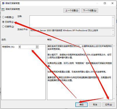6、最后在限制可保留宽带界面中将左上角设置成【已启用】,再将下面【宽带限制】修改成【0】,点击【应用】和【确定】保存修改就可以了