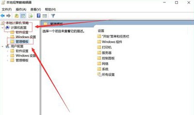 2、在打开的【本地组策略编译器】界面中选择左侧的【计算机配置】,再点击【管理模板】