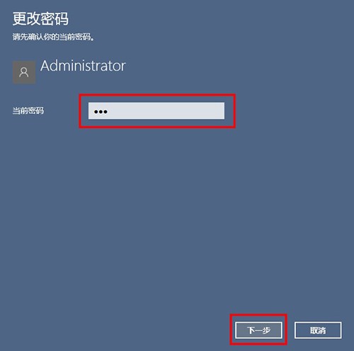5、接着在【更改密码】界面输入当前电脑的开机密码,再点击【下一步】