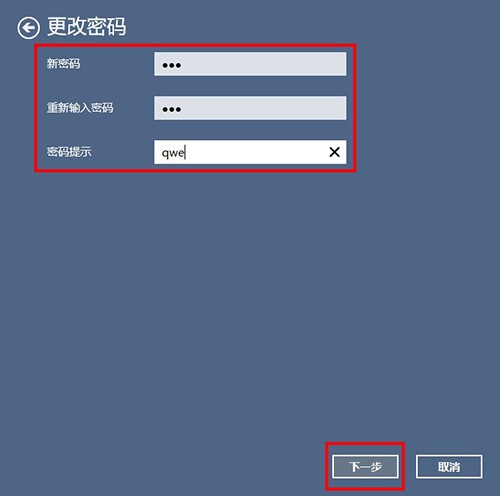 6、然后再将需要设置的密码输入进去,在确定密码中再输入一次,再设置提示,再点击【下一步】