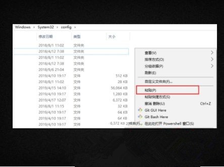 6、按键盘退格键返回上一级“config”目录,在空白处单击右键,在弹出菜单中单击粘贴覆盖注册表文件。重启计算机后配置生效,注册表恢复成功。