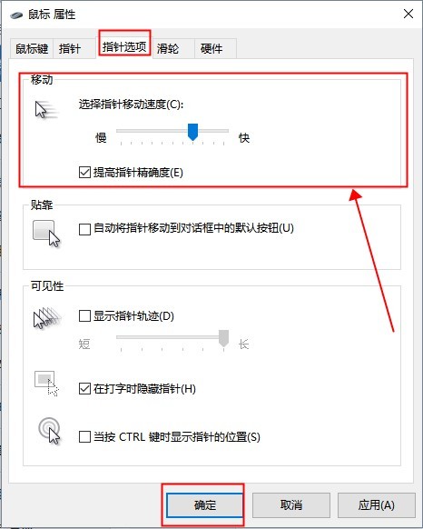 3、设置好后点击上方的【指针选项】,在下方界面的【移动】模块中修改鼠标的移动速度,设置好后点击【确定】保存即可