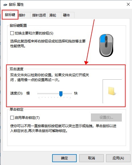 2、接着在打开的鼠标属性界面的【鼠标键】选项卡下方设置【双击速度】