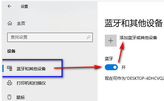 4、选择蓝牙和其它设备,开启Windows10蓝牙功能。