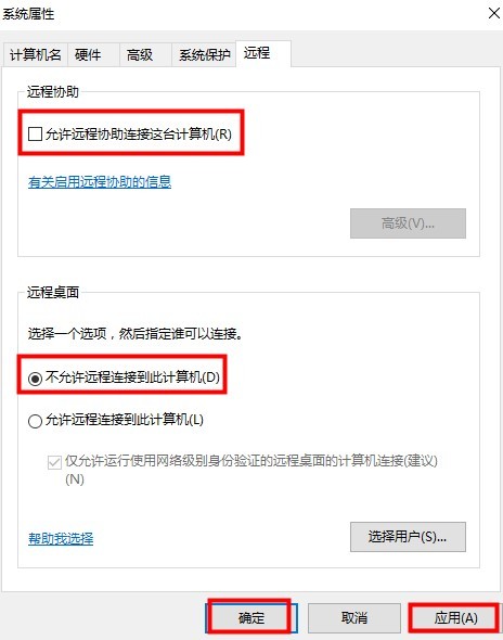 3、接着在弹出的窗口中将【允许远程协助连接这台计算机】取消勾选,并将下方的【远程桌面】设置成【不允许远程连接到此计算机】,点击【应用】和【确定】保存修改