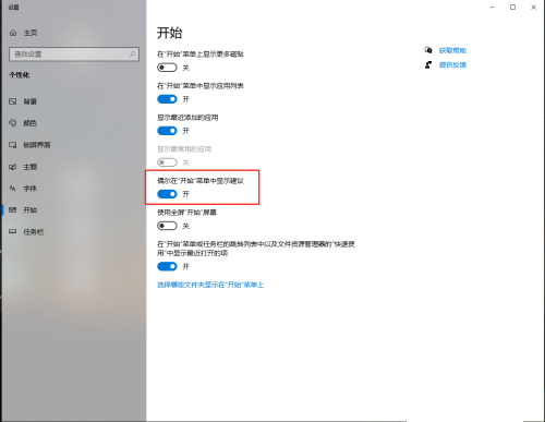 6、在界面中找到并关闭偶尔在“开始”菜单中显示建议按钮。