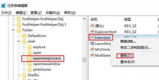 2、定位到:HKEY_CLAssEs_RooTFoldershellopennewprocess,删除字符串值Extended;
