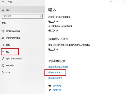 3、在打开的界面中选择左侧的【输入】选项卡,再点击右侧界面的【高级键盘设置】