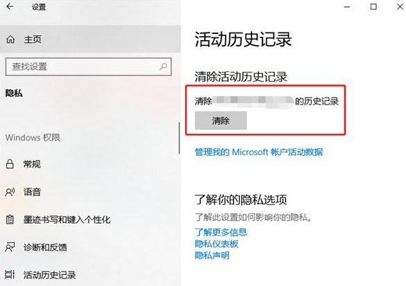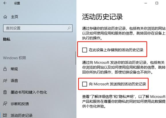 2、然后在“隐私”窗口左侧找到“活动历史记录”,找到并取消勾选右侧中的“在此设备上存储我的活动历史记录”和“向Microsoft发送我的活动历史记录”。