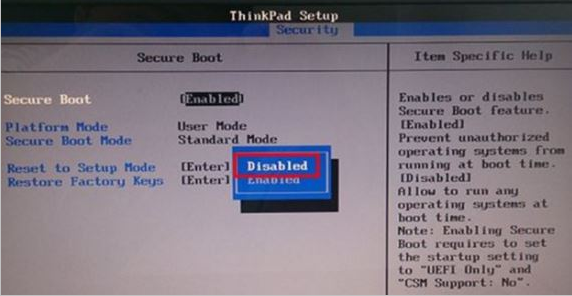 2、在BIOS界面中,使用左右方向键移动到“security”选项卡,选择Secure Boot回车,改成Disabled;