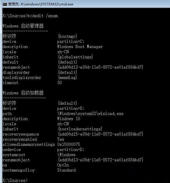 2、在命令提示窗口中输入命令:01bcdedit /enum;如果您看到以下内容,则引导记录已损坏。