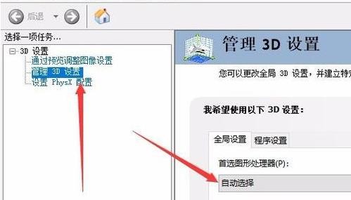4、在打开窗口左侧点击“管理3D设置”在弹出界面找到右侧“首选图形处理器”。