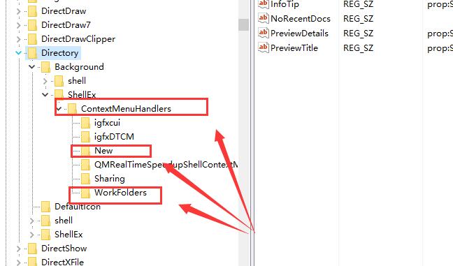 3、然后将除了"new"和"WorkFolders"文件夹,"ContextMenuHandlers"中的所有文件夹全部删除。
