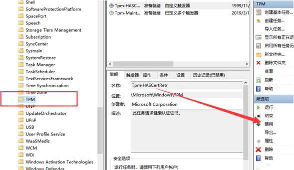 6、找到其中的"TPM"文件,选中点击右侧窗口中的"禁用"就可以了。