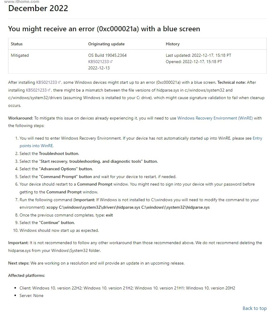 微软表示这个错误是由于system32 中的 hidparse.sys 和 Windows 文件夹中的 system32 / drivers 的文件版本不匹配造成的,导致了签名验证失败。因为该问题目前从Win10 20H2 到 Win10 22H2 功能更新均受到影响,。微软表示正在努力修复这个问题。
