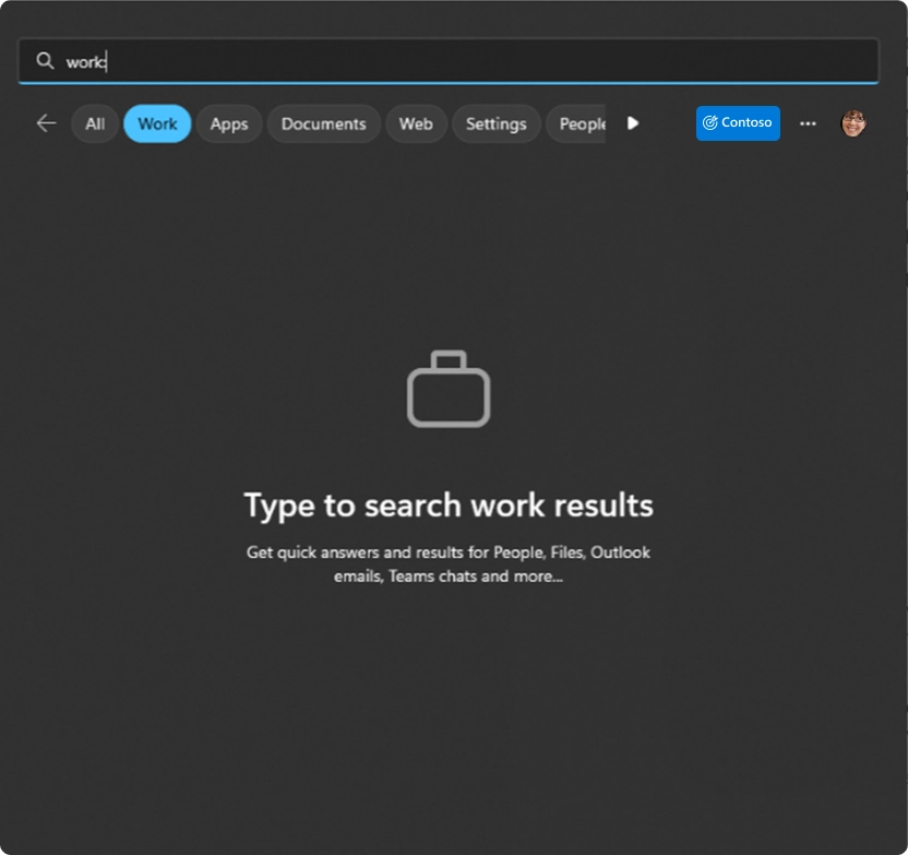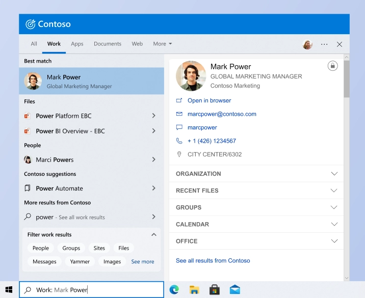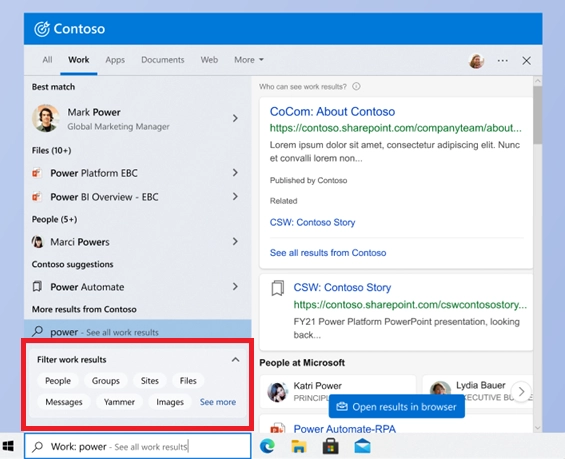 微软对于该功能的描述是"为工作场所搜索量身定制","为Windows Search 中快速可靠的组织范围搜索"。据公司称,它返回Microsoft 365 数据和第三方数据,并且能够"提高相关工作成果的可发现性"。