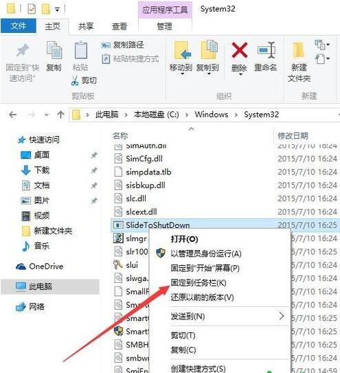 2、选中右击菜单选项中的"固定到任务栏",这样就将滑动关机的命令添加到任务栏中了。
