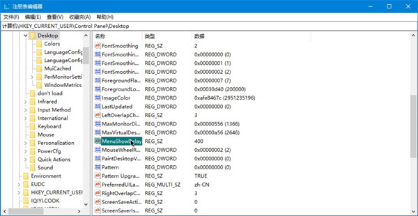 4、找到右侧中的"MenuShowDelay"双击打开。