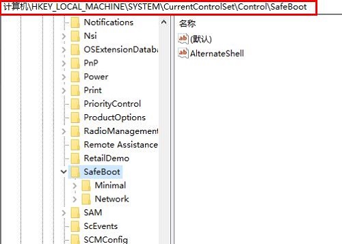 5、进入新界面后,依次点击"HKEY_LOCAL_MACHINESYSTEMCurrentControlSetControlSafeBoot"。
