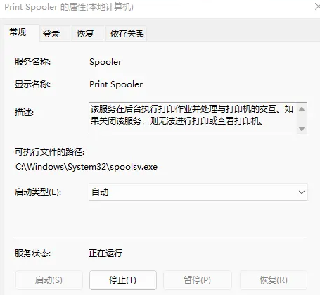 4、在打开的Print Spooler 的属性中,点击服务状态中的停止,在点击启动功能。